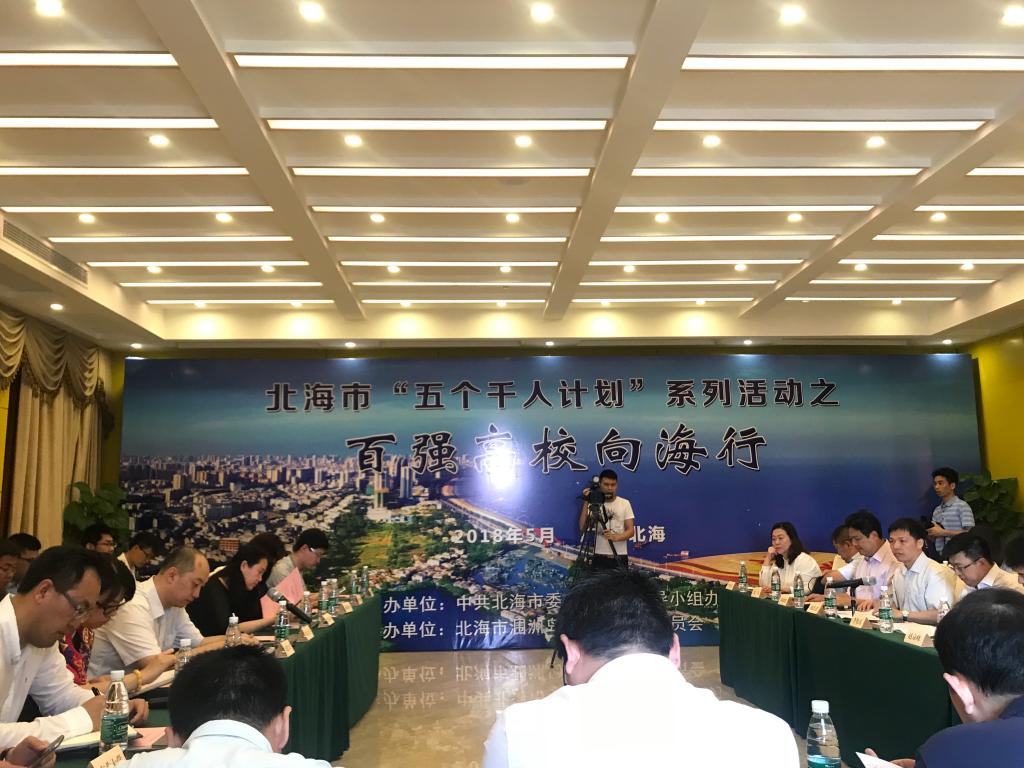 2018年5月8日上午8:30,北海市“五千人计划”系列活动之百强高校向海行—高校人才交流座谈会在北海市举行,全国近30所高校代表参加,我校应邀出席。会议由北海市委组织部副部长、老干部局长陆忠进同志主持。