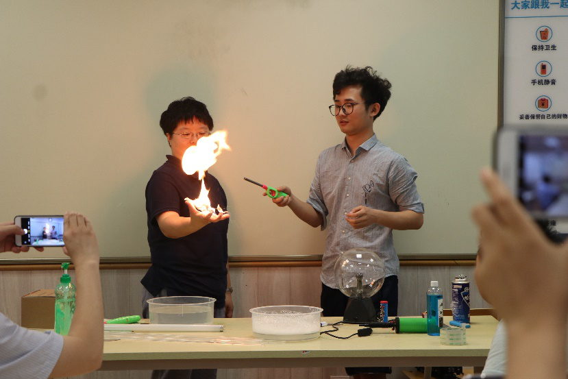 在体验了小学的教学授课系统后,一行人来到了学而思物理实验馆,体验初一学生的物理启蒙课。在实验课中,学而思老师为老师们展示了有关声光热力电的实验,器材简单安全方便操作。行程的最后,我校一行人来到学而思的双师课堂体验双师科技,并合影留念。